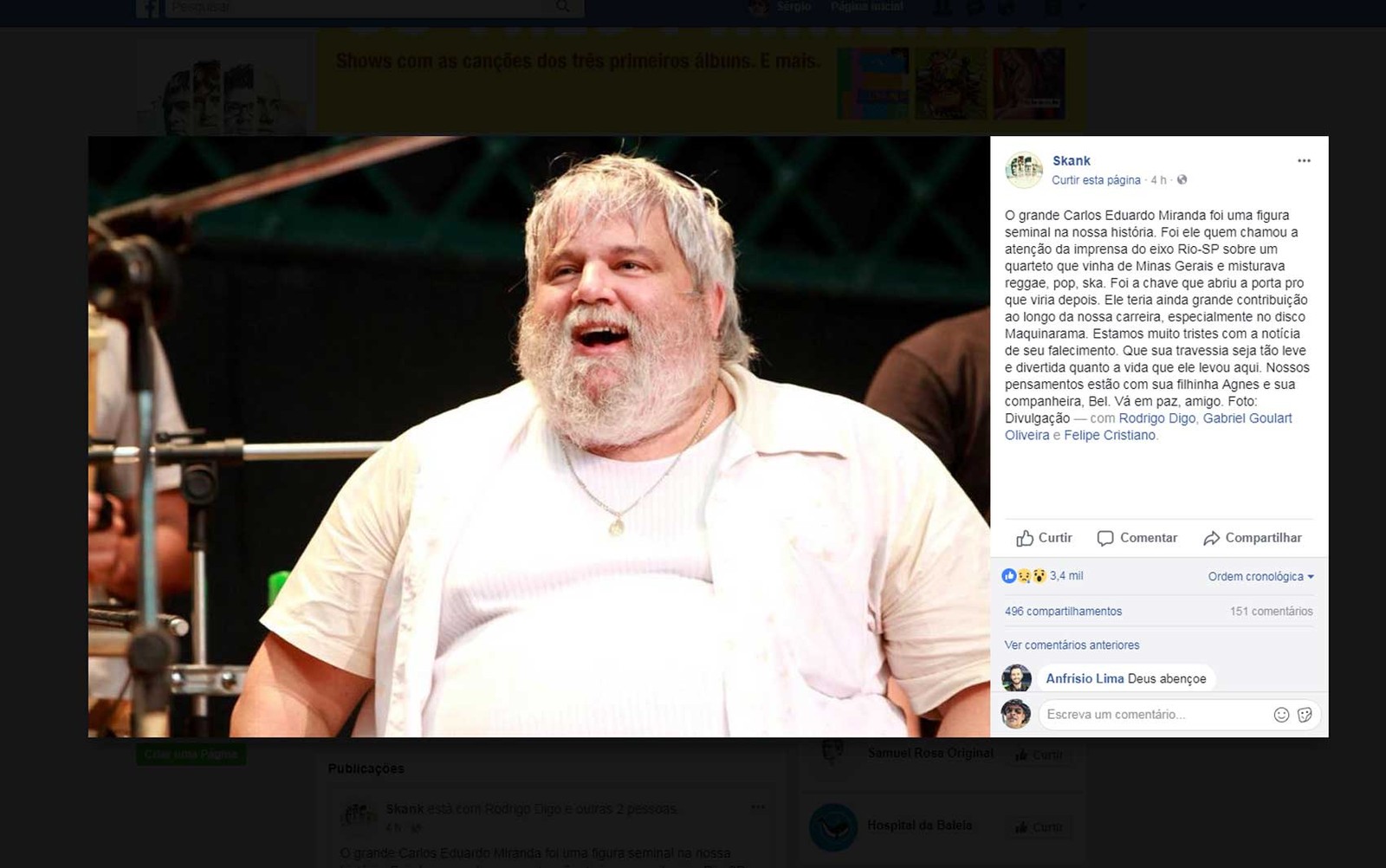 “Foi ele quem chamou a atenção da imprensa do eixo Rio-SP sobre um quarteto que vinha de Minas Gerais. Vá em paz, amigo”, postou o perfil oficial da banda Skank no Facebook.